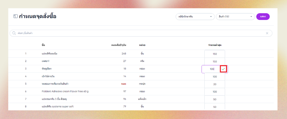 ผู้ใช้งานสามารถคลิกปรับที่จำนวนต่ำสุดของรายชื่อสินค้าที่ต้องการกำหนดได้