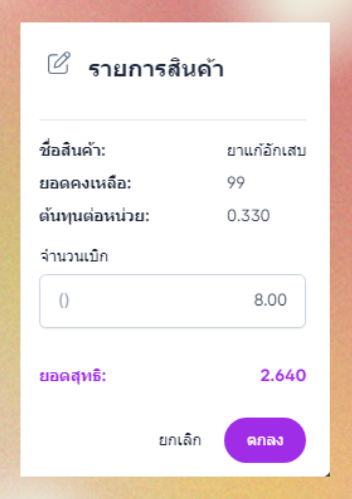 ผู้ใช้งานเลือกสินค้าระบบจะแสดงรายการสินค้าที่ผู้ใช้งานเลือกจากนั้นระบุจำนวนที่ต้องการเบิกและกดตกลง