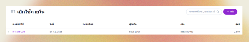 เมื่อมีการเบิกใช้ภายในและตัดจ่าย ผู้ใช้งานสามารถทำรายการที่นี้เพื่อบันทึกข้อมูลได้