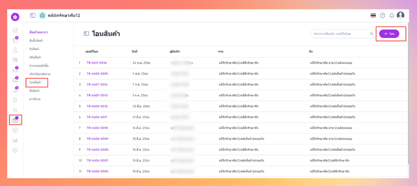 - เลือกหัวข้อสินค้าและยา > โอนสินค้า ผู้ใช้งานจะเข้าสู่หน้าโอนสินค้า