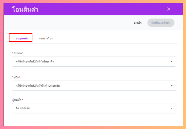 ระบบจะแสดงหน้าต่างโอนสินค้าให้ผู้ใช้งานเลือกคลังที่โอน และ คลังที่รับ เลือกผู้บันทึก