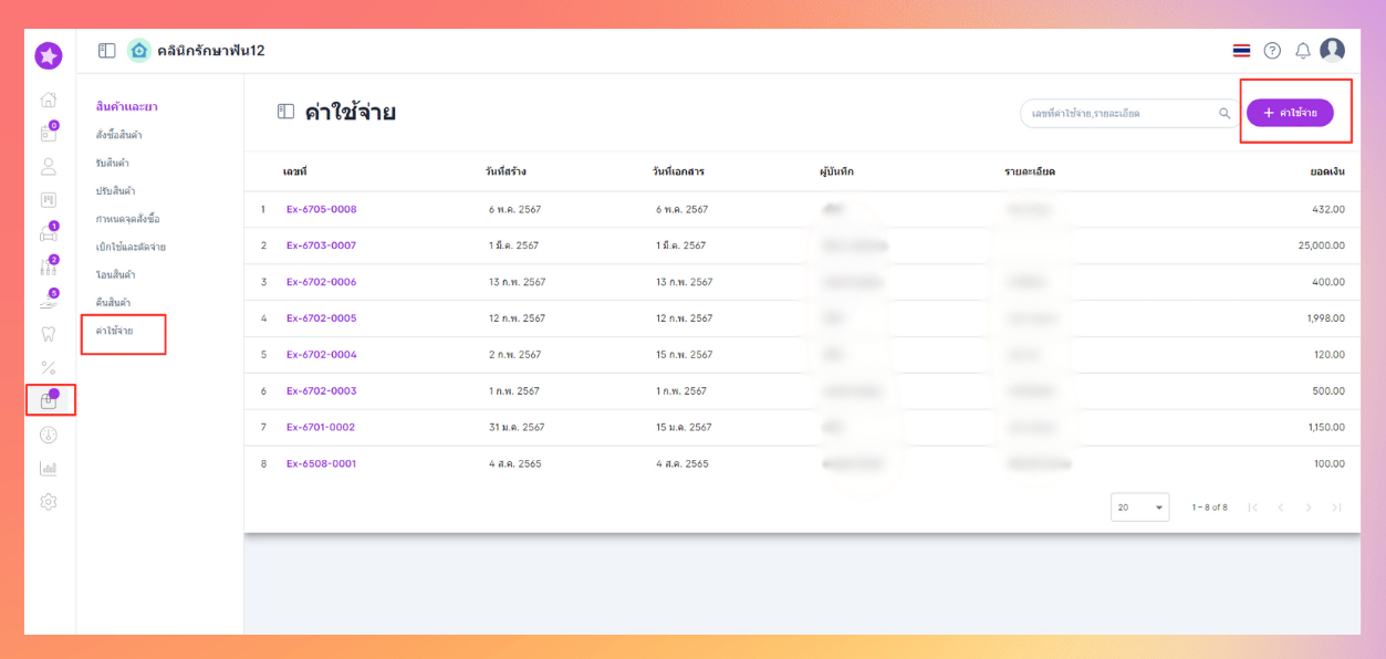 - เลือกหัวข้อสินค้าและยา > ค่าใช้จ่าย ผู้ใช้งานจะเข้าสู่หน้าค่าใช้จ่าย