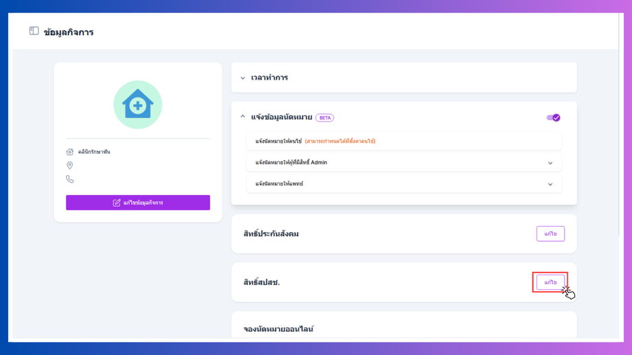 เข้าสู่หน้าข้อมูลกิจการ เลือกที่หัวข้อสิทธิ์สปสช. คลิกที่แก้ไข