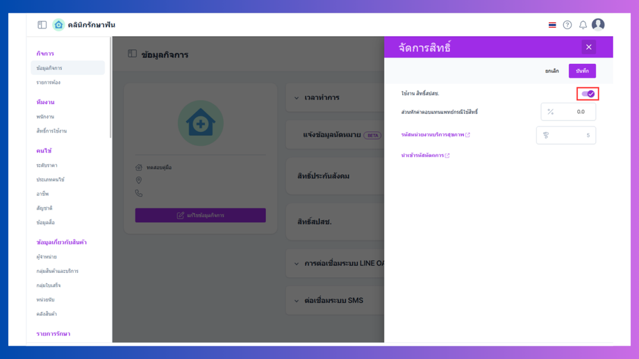 ในการส่งข้อมูลในทาง สปสช โดยผ่านระบบ KTB Health Digital Platform สามารถเปิดใช้งานในส่วนของการตั้งค่ากิจการ ในกรณีที่ทางคลินิกมีการลงทะเบียนและได้รับสิทธิการเข้าร่วมโครงการกับทาง สำนักงานหลักประกันสุขภาพแห่งชาติ (สปสช) สามารถทำการเปิดระบบเพื่อการบันทีกข้อมูลที่เกี่ยวข้องได้