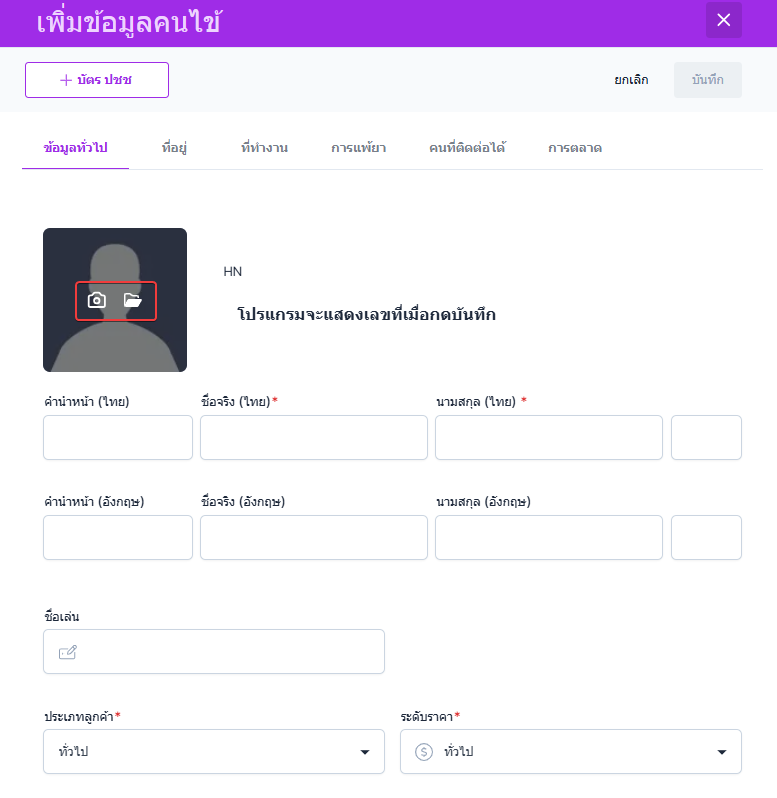 สามารถเพิ่มรูปคนไข้จากการถ่ายรูป หากมีกล้อง webcam สามารถคลิ๊กที่รูป > เลือกรูปกล้อง >จากนั้นถ่ายภาพคนไข้แล้วบันทึกได้เลยครับ