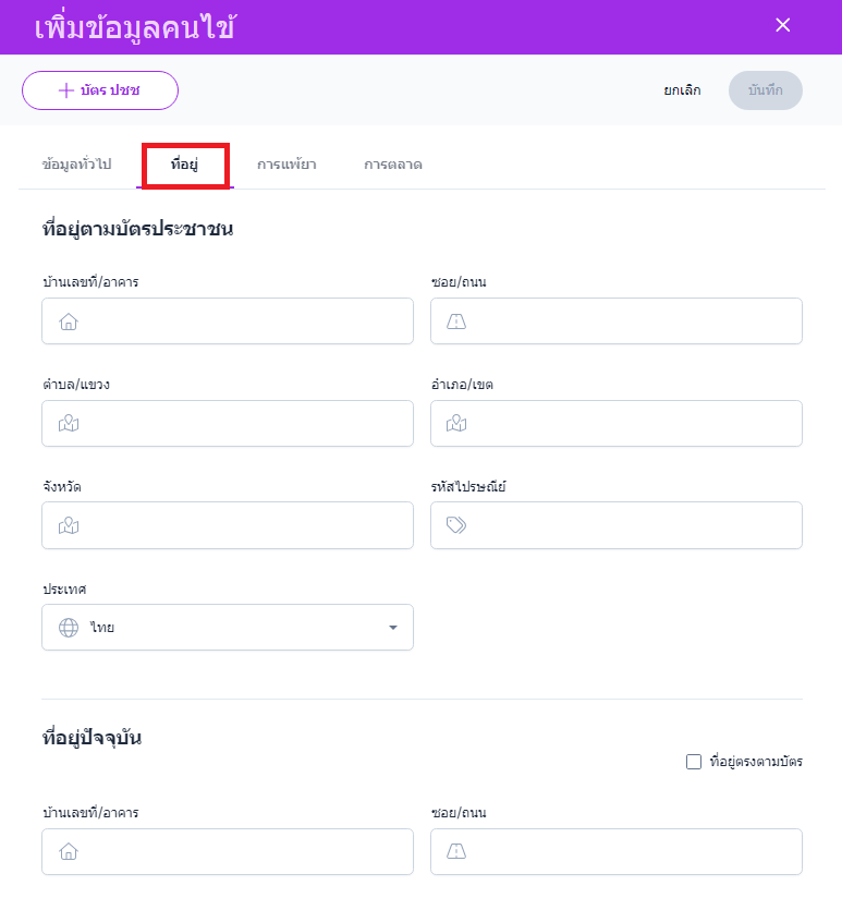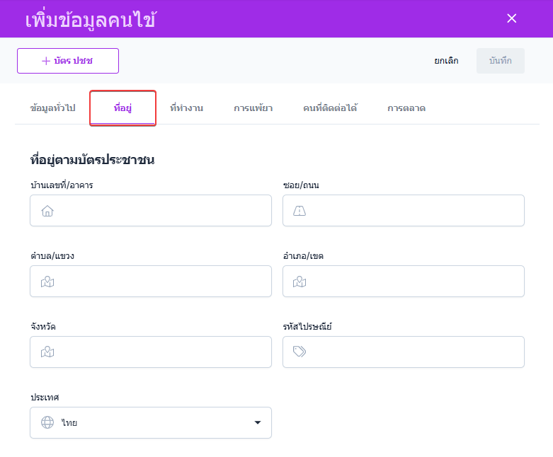 หากไม่มีบัตรประชาชนหรือไม่สามารถใช้เครื่องอ่านบัตรได้ กรุณากรอกข้อมูลทั่วไป และที่อยู่ ของคนไข้ด้วยตนเอง