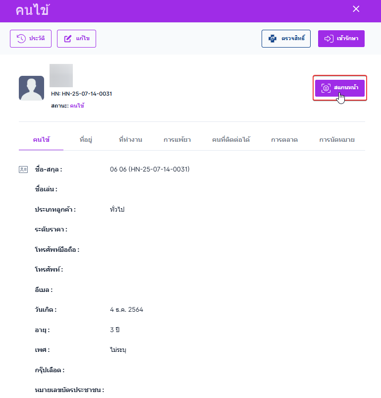 สแกนหน้าผู้ใช้ต้องเพิ่มรูปคนไข้ก่อนถึงจะสแกนใบหน้าได้ คลิกสแกนหน้า