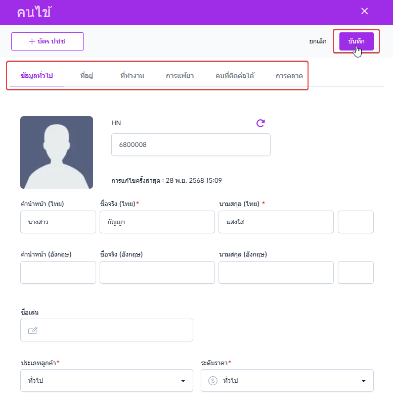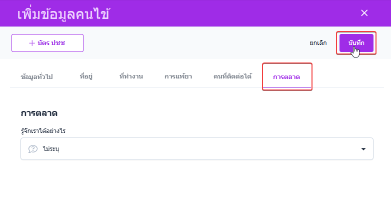ข้อมูลทางการตลาด ระบบจะเก็บข้อมูลเพื่อวิเคราะห์ทางการตลาดได้ เมื่อผู้ใช้งานกรอกข้อมูลเสร็จแล้วกดปุ่มบันทึกเพื่อเพิ่มคนไข้เข้าสู่ระบบ
