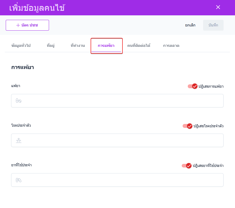 ผู้ใช้งานกรอกข้อมูลการแพ้ยาของคนไข้ หรือปฎิเสธการแพ้ยา