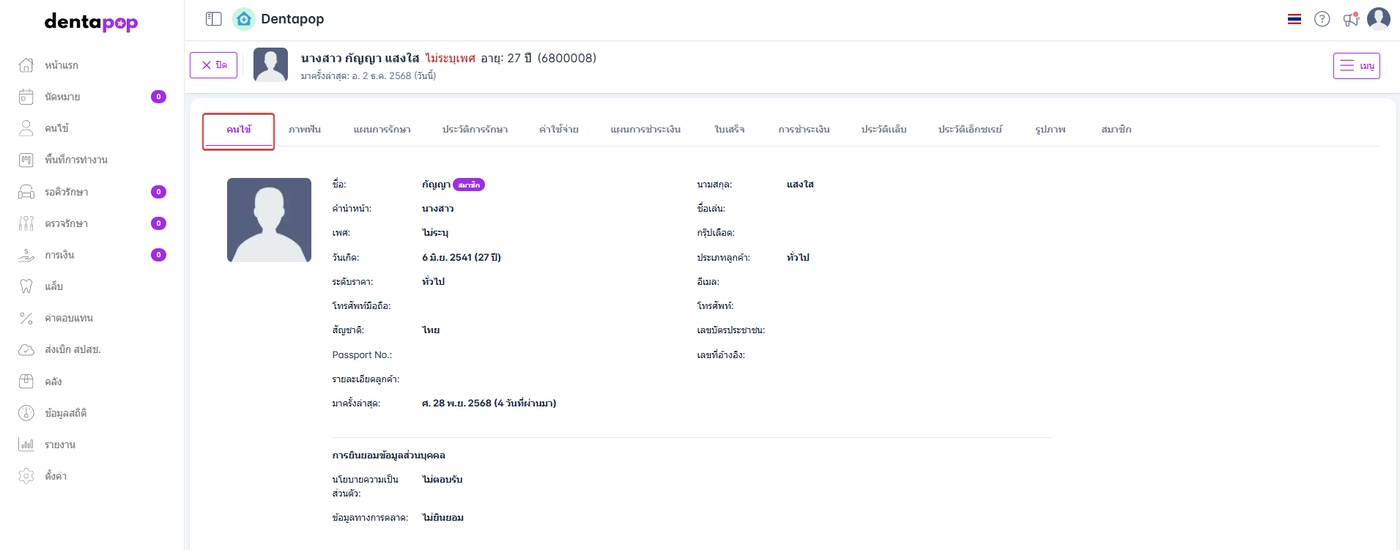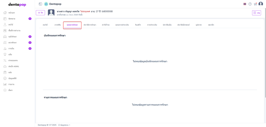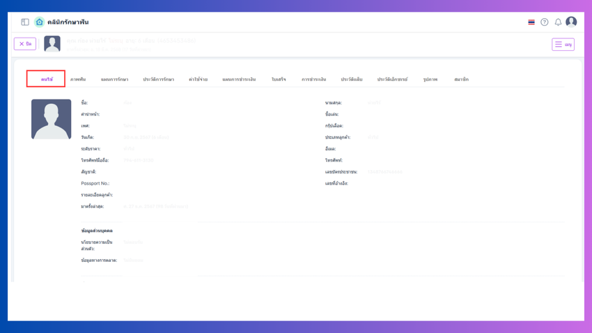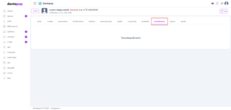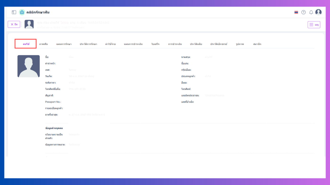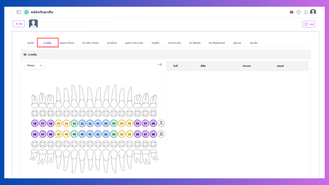ในหน้าประวัติคนไข้ประกอบด้วย ข้อมูลคนไข้, ภาพฟัน, แผนการรักษา, การรักษา, ค่าใช้จ่าย, แผนการชำระเงิน, ใบเสร็จ, การชำระเงิน, ประวัติแล็บ, ประวัติเอ็กซเรย์, รูปภาพ, สมาชิก
