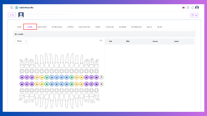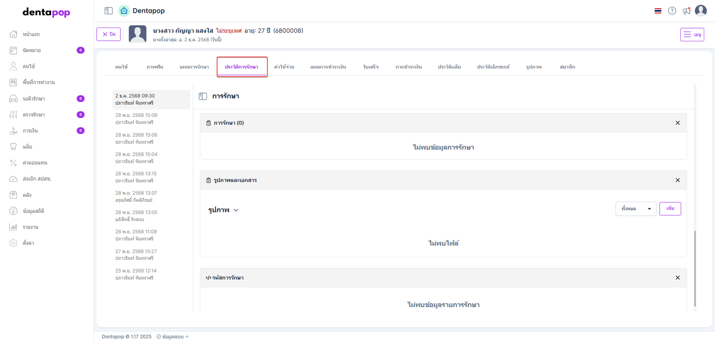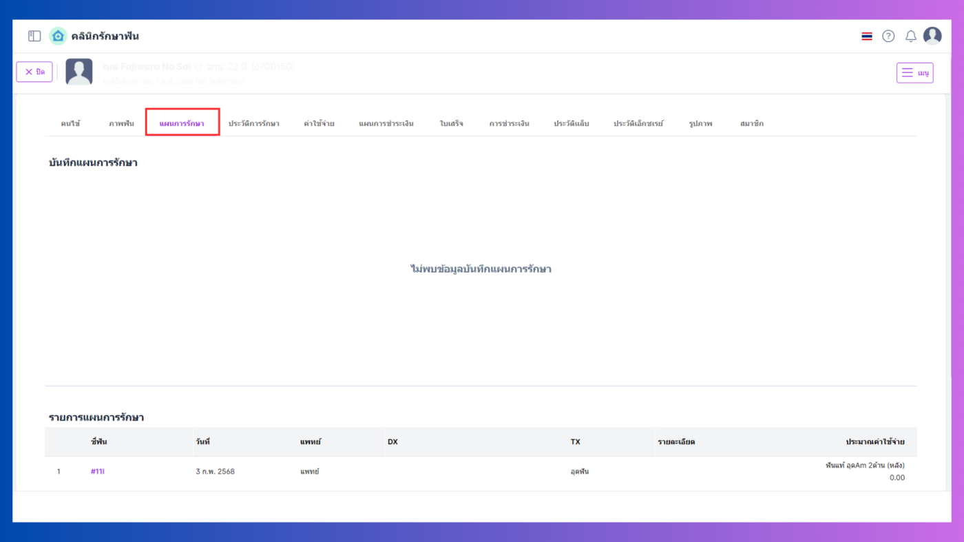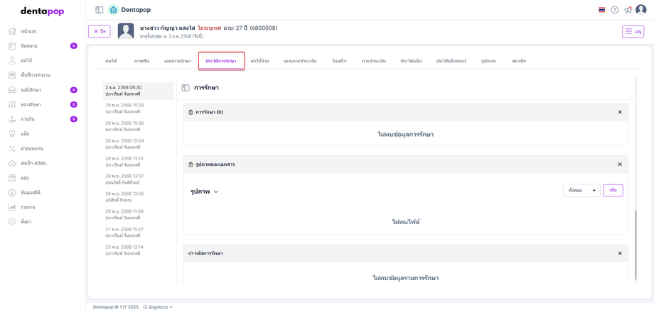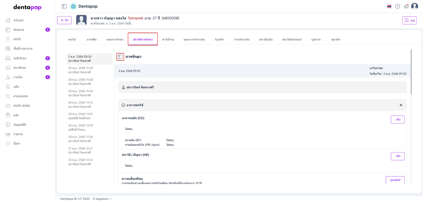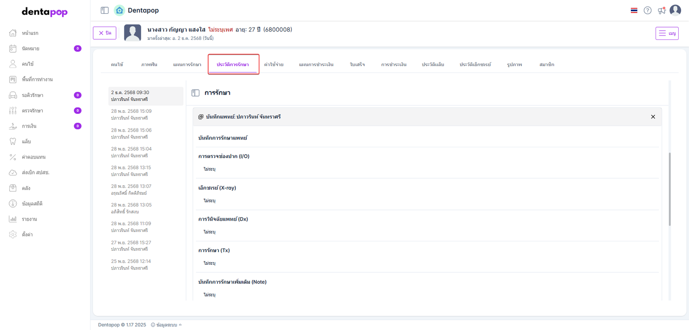 เมื่อแพทย์คีย์รายการรักษา ระบบจะบันทึกและแสดงที่ข้อมูลฟันในหน้าประวัติคนไข้