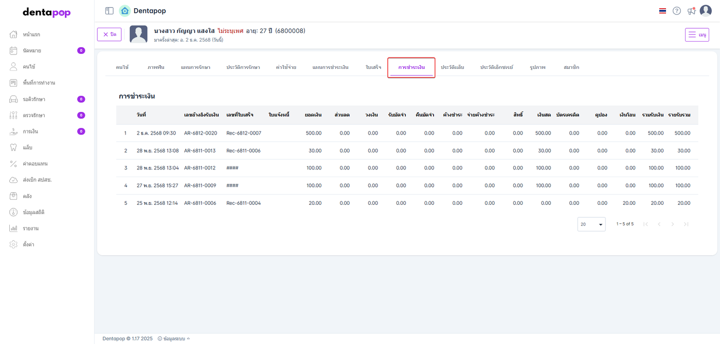 ประวัติการชำระเงินทั้งหมดของคนไข้ที่มาใช้บริการ ถูกแสดงผลและจำแนกเป็นหัวข้อ ดังนี้