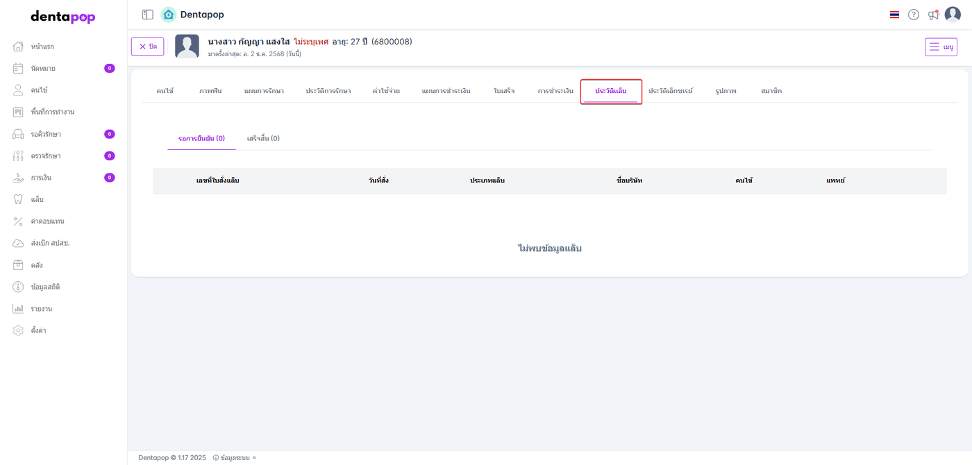 แสดงข้อมูลประวัติการสั่งแล็บของคนไข้ โดยแยกเป็นรายการที่รอยืนยัน หรือ รายการที่เสร็จสิ้น
