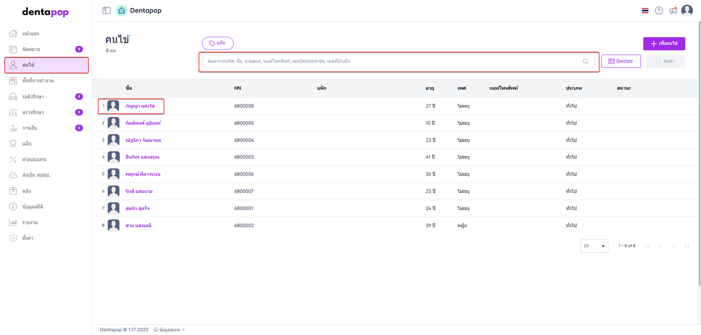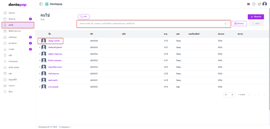 ไปที่เมนูคนไข้ จากนั้น ค้นหาคนไข้โดยการเสียบบัตรประชาชน หรือ พิมพ์ค้นหา ชื่อ,รหัส,เบอร์โทร ที่ต้องการแก้ไขข้อมูล