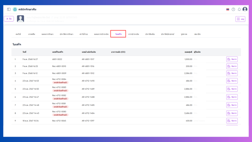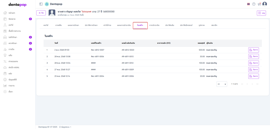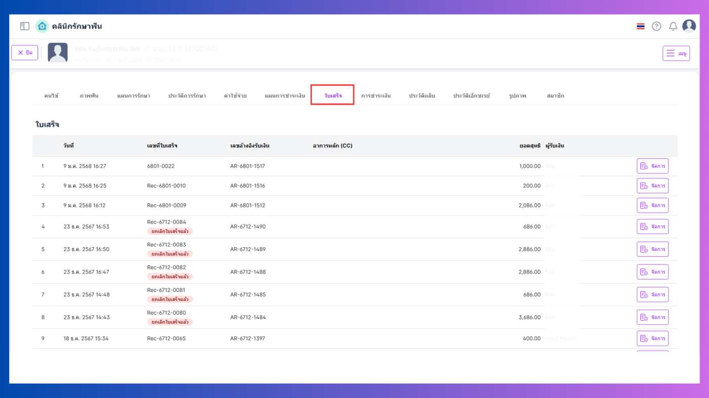 รายการใบเสร็จของคนไข้ทั้งหมด