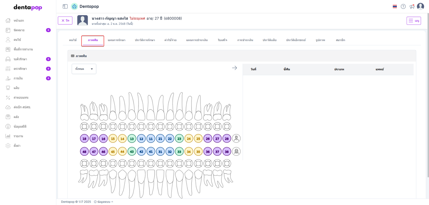 ข้อมูลฟันของคนไข้ จะแสดงรายการที่บันทึกจากรายการรักษาในห้องตรวจ
