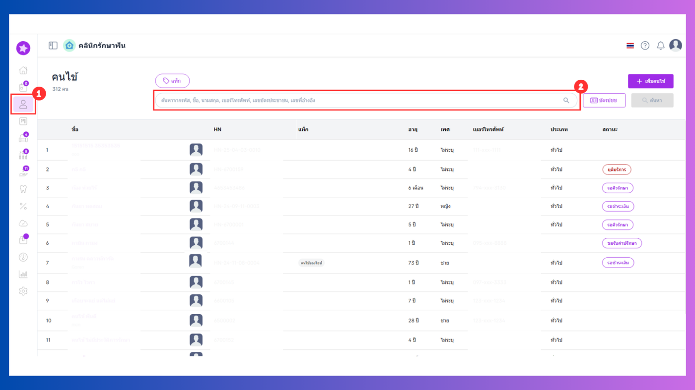 - ไปที่เมนูคนไข้ จากนั้น ค้นหาคนไข้โดยการเสียบบัตรประชาชน หรือ พิมพ์ค้นหา ชื่อ,รหัส,เบอร์โทร ที่ต้องการแก้ไขข้อมูล
