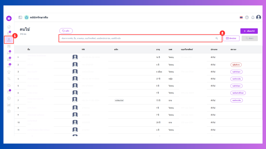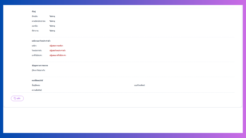 ผู้ใช้งานจะเข้าสู่หน้าข้อมูลคนไข้จะแสดงข้อมูลคนไข้ต่อไปนี้