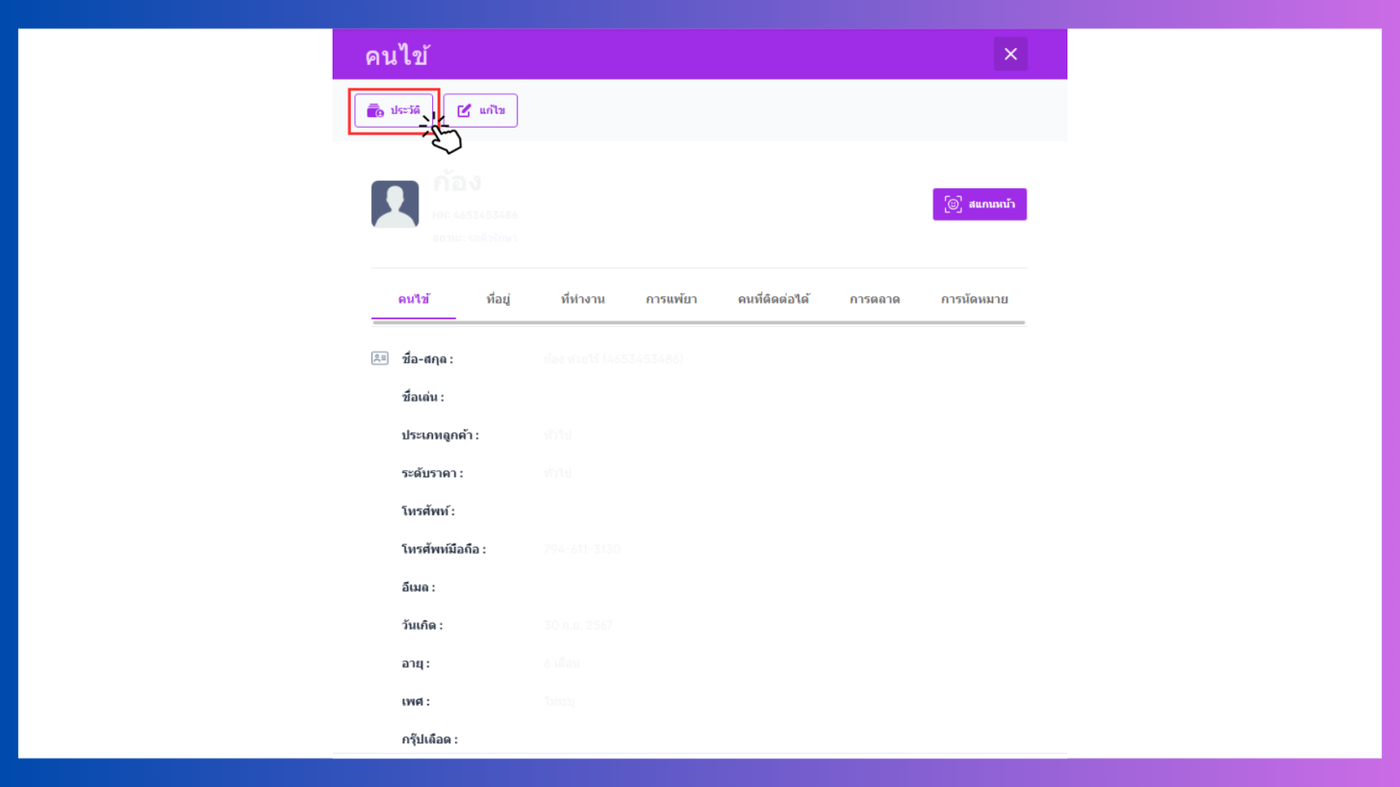 - จากนั้นคลิกที่ชื่อคนไข้ ระบบจะแสดงข้อมูลคนไข้ กดคลิก ประวัติ