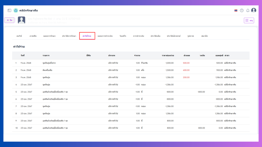 แสดงรายละเอียดค่าใช้จ่ายของคนไข้ วันที่ รายการ ซี่ฟัน ประเภท จำนวน ราคาต่อหน่วย ส่วนลด วงเงิน ยอดสุทธิ และสาขา