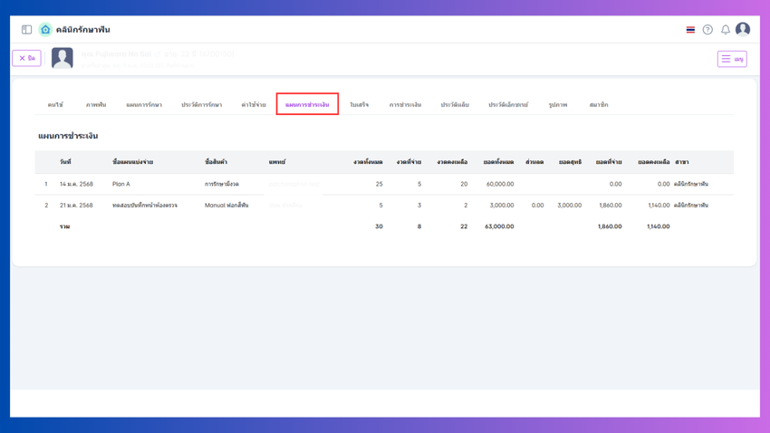 แสดงรายการแผนการชำระเงินของคนไข้ ประกอบด้วย