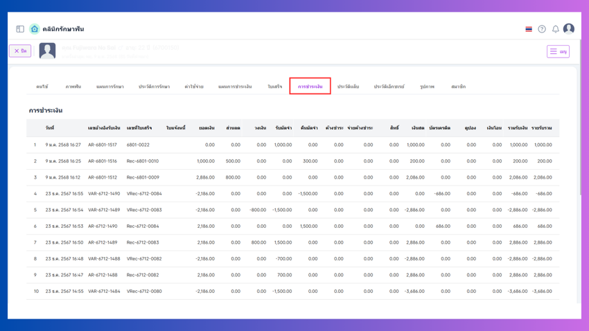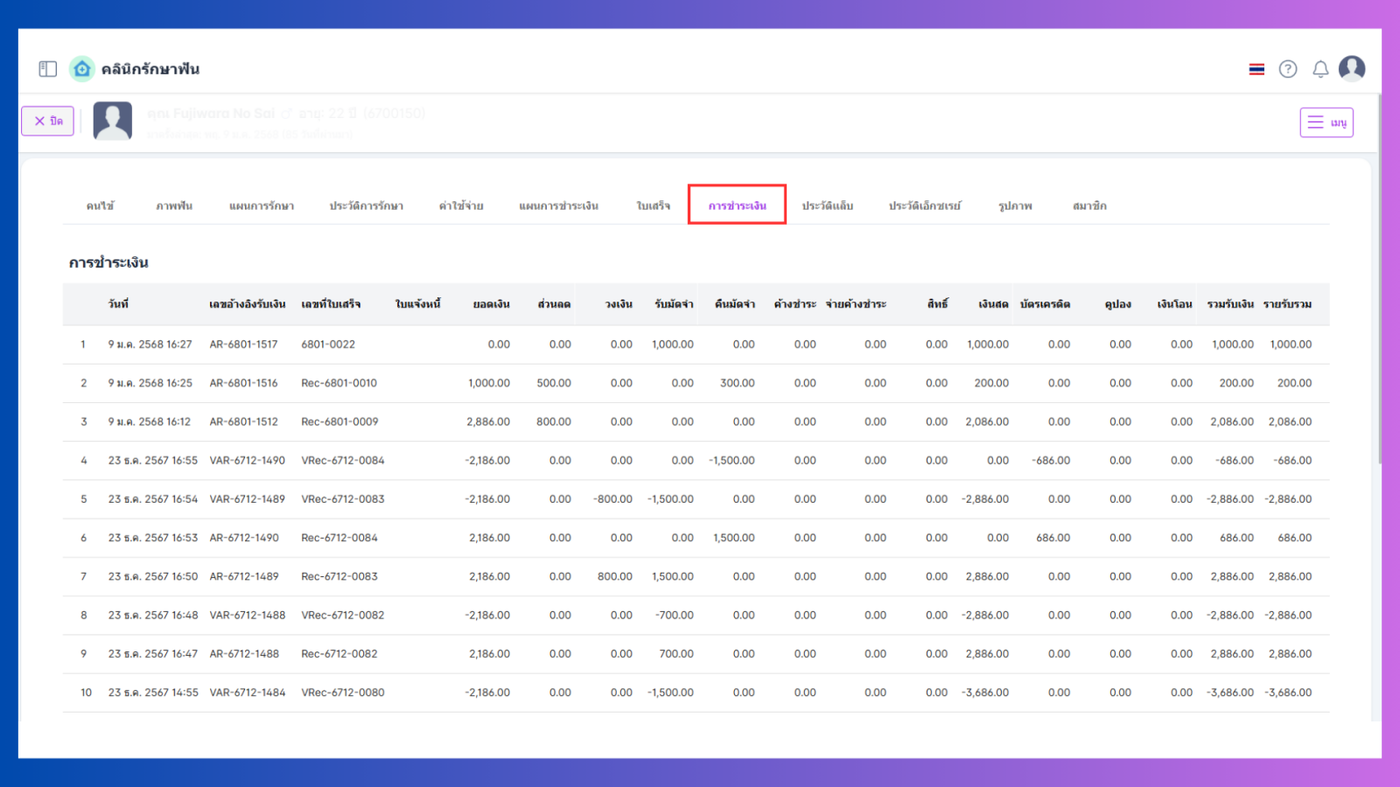 ประวัติการชำระเงินทั้งหมดของคนไข้ที่มาใช้บริการโดยจะแสดงรายละเอียดดังนี้
