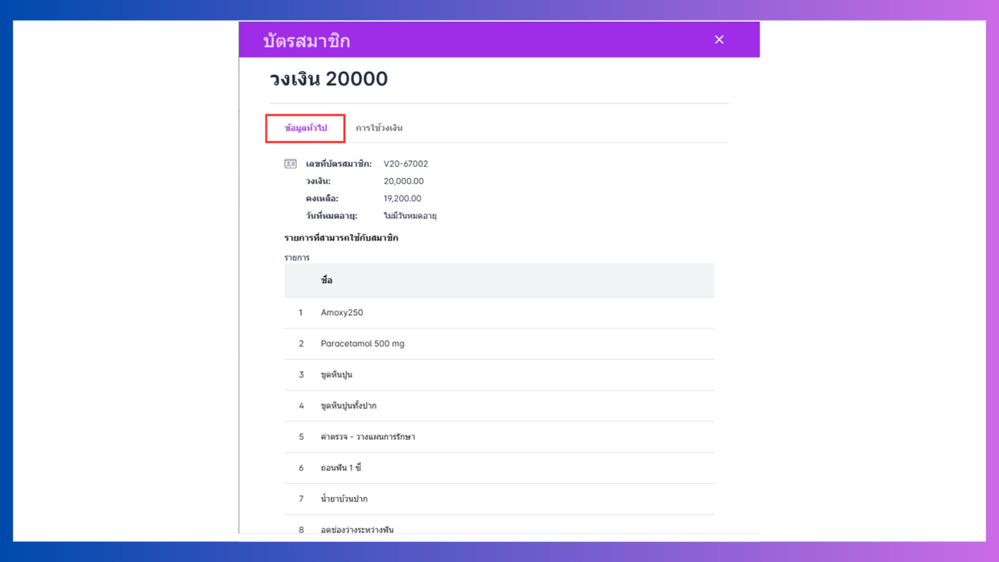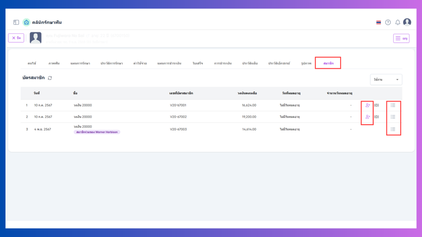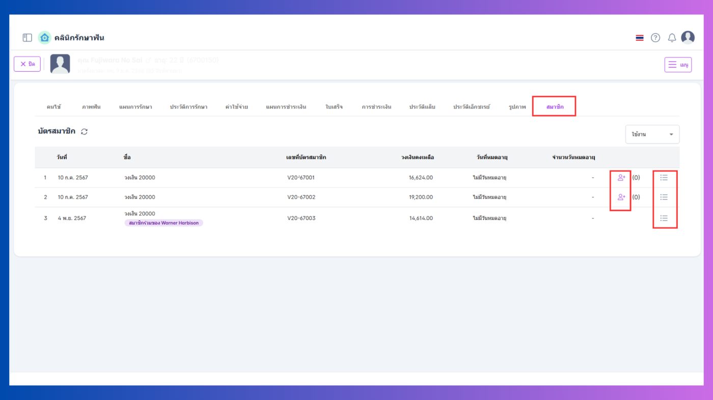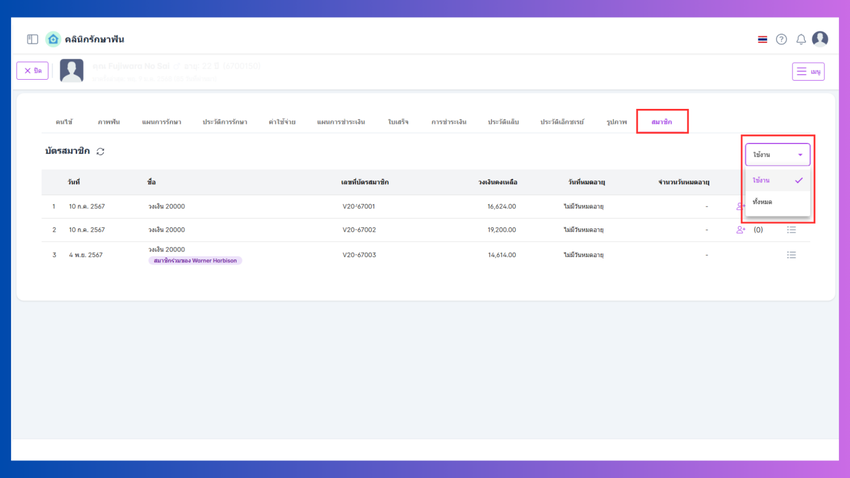 หากคนไข้ได้ทำการสมัครสมาชิก จะมีข้อมูบัตรสมาชิกแสดงในแท็บสมาชิก
