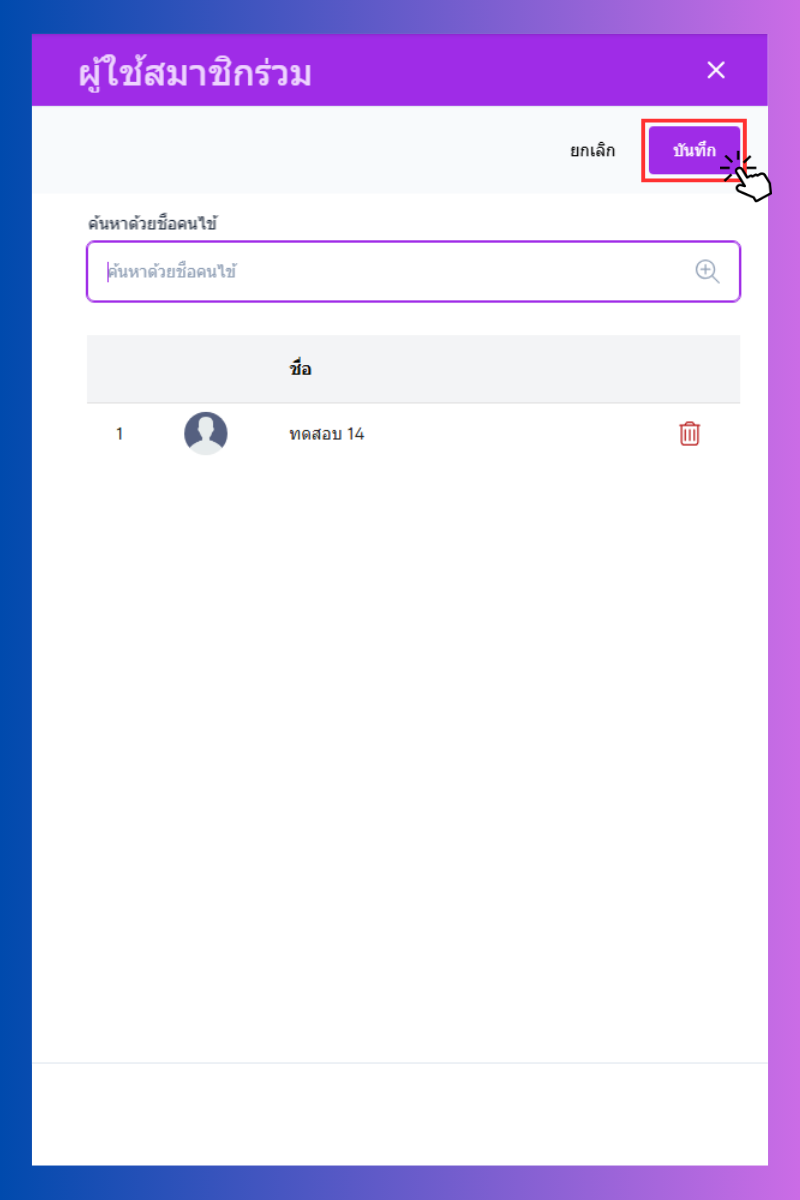 - สามารถเพิ่มผู้ใช้สมาชิกร่วมได้ โดยกดที่ไอคอนรูปคน+ ด้ายซ้าย ถัดจากจำนวนวันหมดอายุ โดยการค้นหาที่ชื่อคนไข้ที่ต้องการเป็นสมาชิกร่วม และกดบันทึก