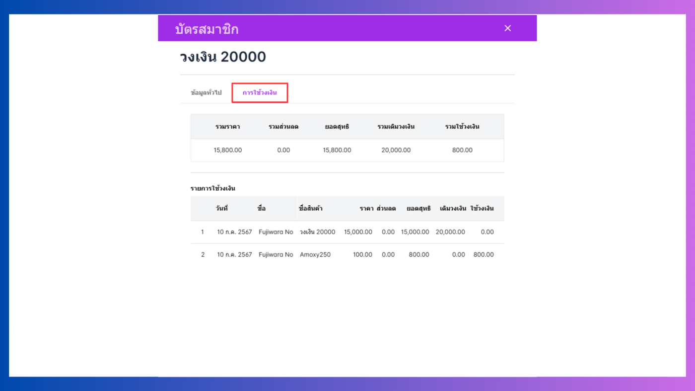 - โดยแสดงข้อมูลวันที่สมัคร ชื่อบัตรสมาชิก เลขที่บัตรสมาชิกวงเงิน ยอดคงเหลือ วันที่บัตรสมาชิกหมดอายุ และจำนวนวันหมดอายุ