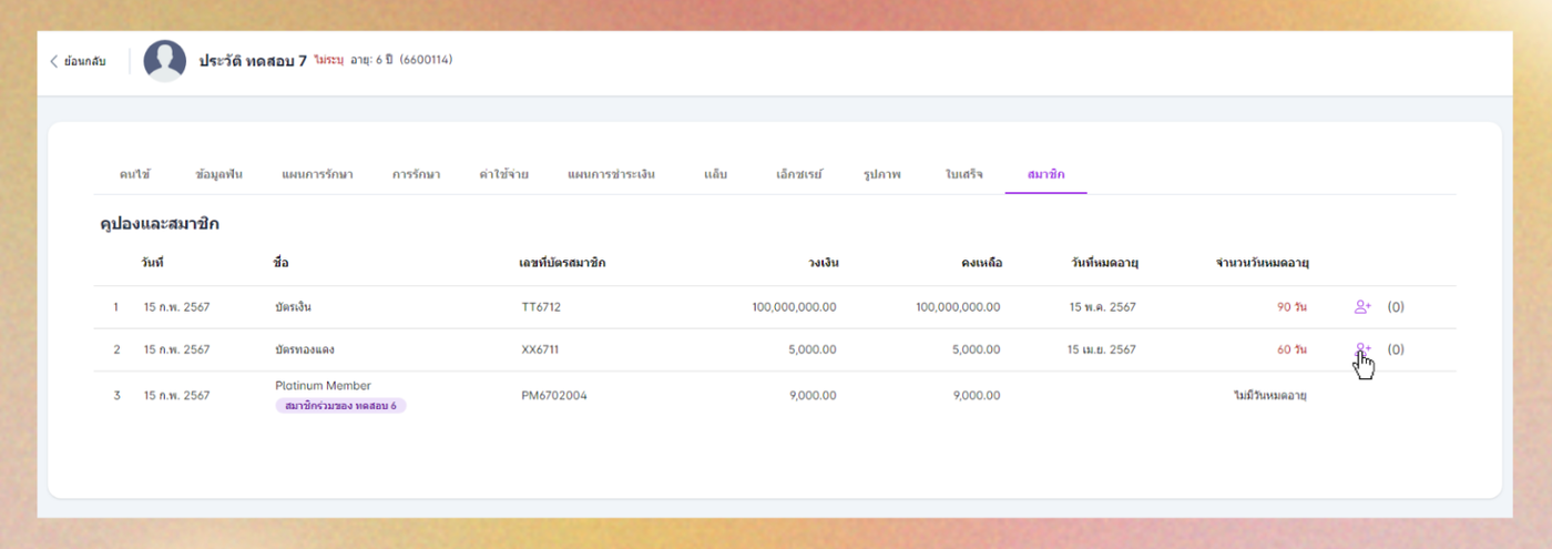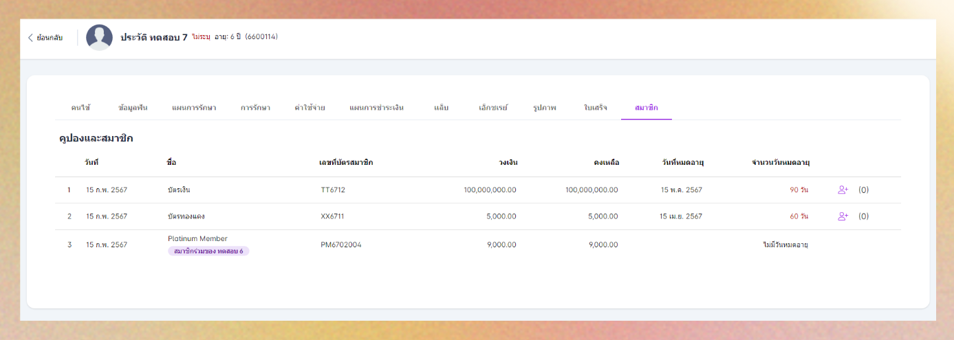 ในหน้าประวัติคนไข้ จะแสดงรายการคูปองสมาชิกที่คนไข้สามารถใช้งานได้ (ในกรณีที่ไม่ใช่เจ้าของบัตรจะแสดงสถานะเป็นสมาชิกร่วม)