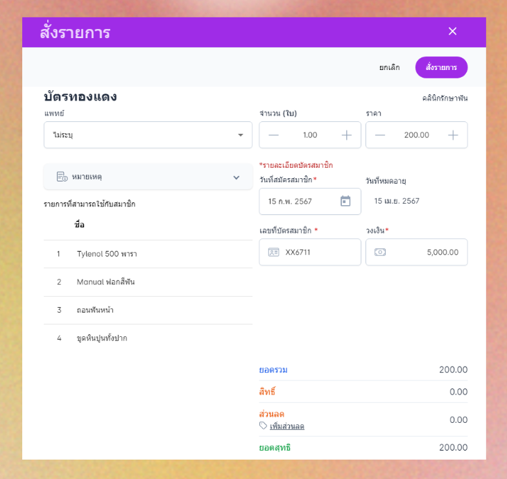ระบบจะบันทึกข้อมูลรายการคูปองสมาชิกในประวัติคนไข้เมื่อทำการซื้อสำเร็จ
