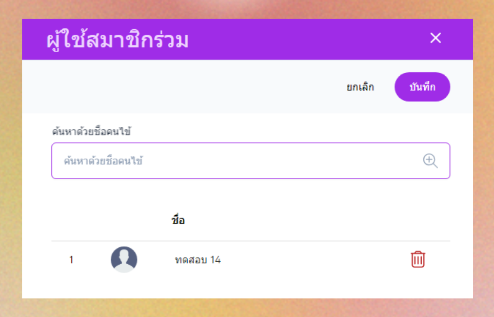 ในกรณีที่ต้องการลบผู้ใช้ร่วมออกจากบัตรสมาชิกสามารถคลิกที่ไอคอนลบ จากนั้นกดบันทึกได้ ระบบจะลบรายชื่อผู้ใช้สมาชิกร่วมออก
