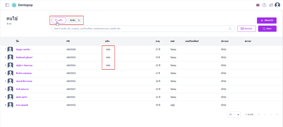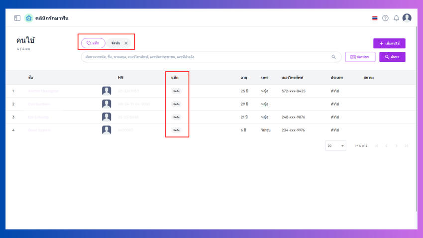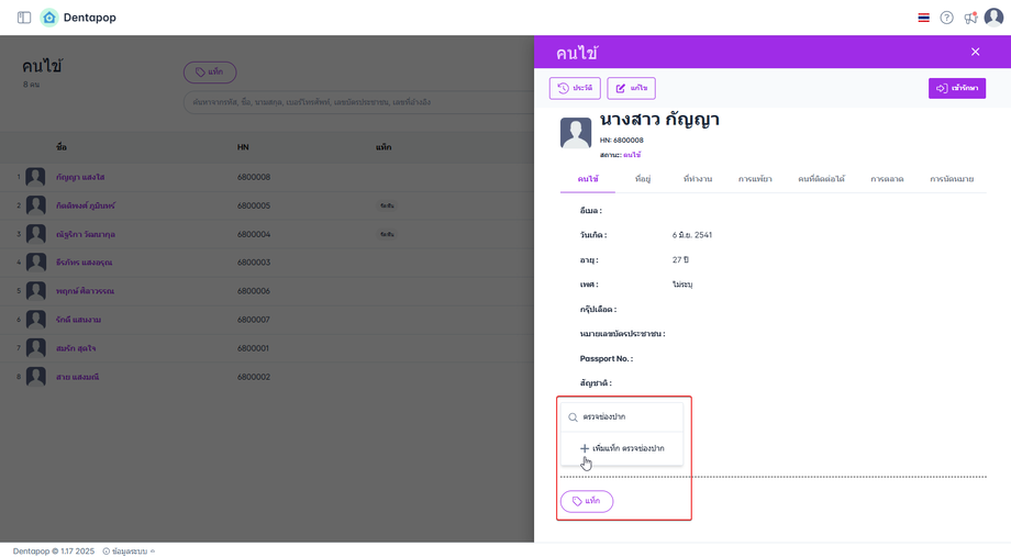 ข้อมูลคนไข้ ในหน้าค้นหาคนไข้