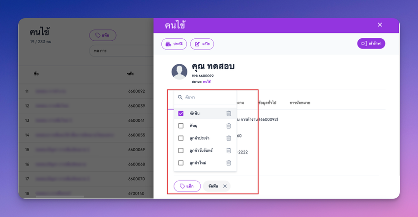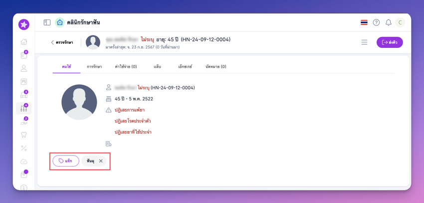 ข้อมูลแทค คนไข้ เป็น ช่วยให้การค้นหาข้อมูลคนไข้ ได้สะดวกยิ่งขึ้น โดยสามารถเพิ่ม และ ลบ แทค ของคนไข้ ได้ที่ ข้อมูลคนไข้ ในหน้าการค้นหาคนไข้ และในส่วนของ tab คนไข้ ในหน้า รอรับการรักษา ห้องตรวจ และการเงิน