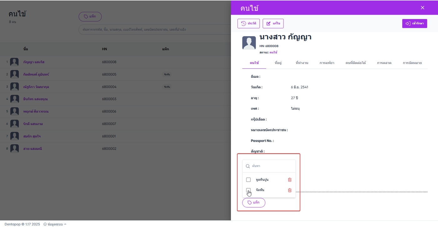 ผู้ใช้งานสามารถเลือกแท็ก(Tag)ให้คนไข้เพื่อความสะดวกในการค้นหาคนไข้และจำแนกคนไข้