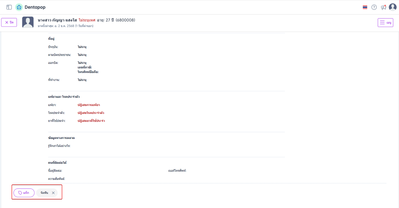 ผู้ใช้งานสามารถดูแท็ก(Tag)ของคนไข้ได้ที่หน้าข้อมูลคนไข้ ซึ่งแท็ก(Tag)จะอยู่ด้านล่าง