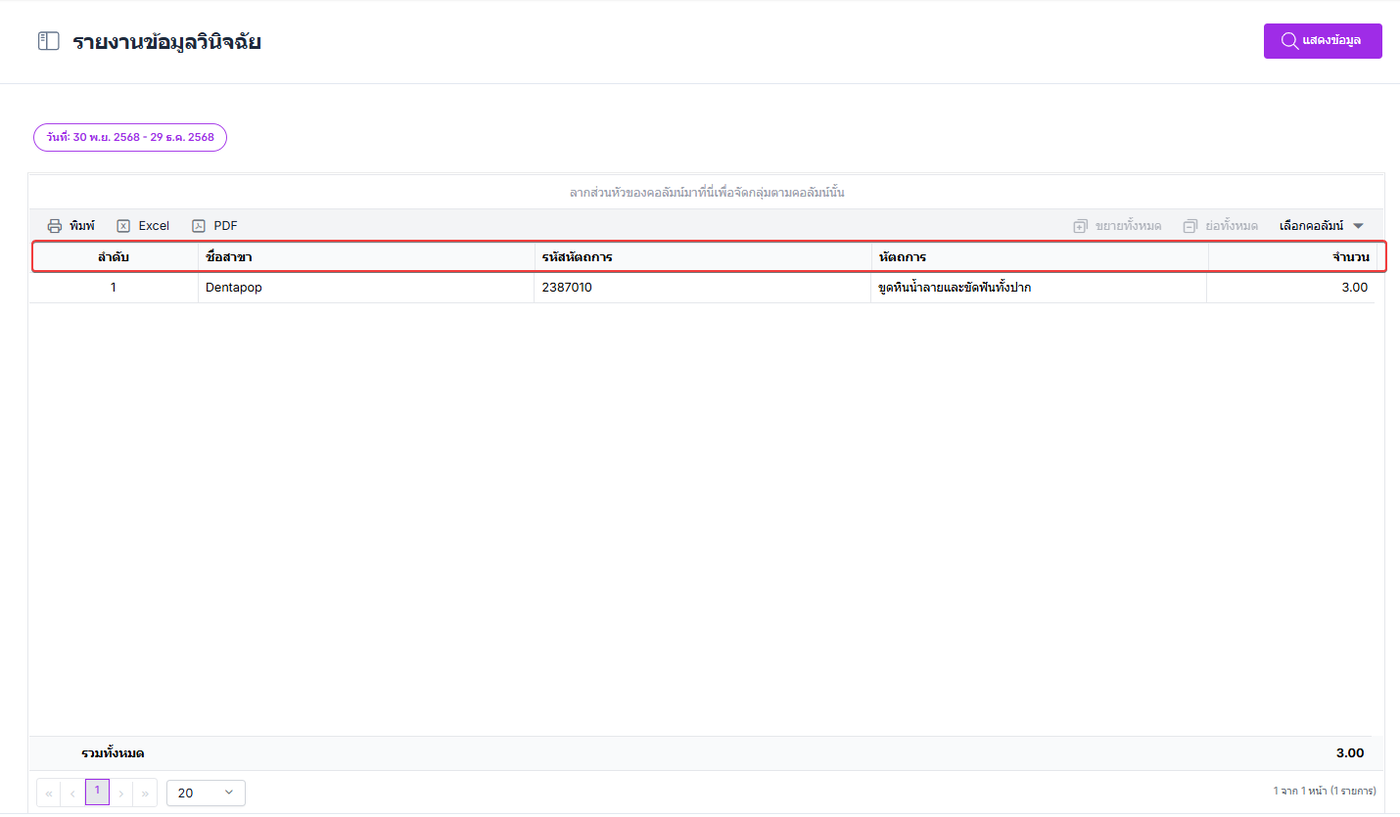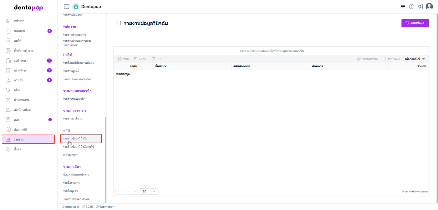 รายงานข้อมูลวินิฉัยเป็นรายงานที่แสดงรายละเอียดจำนวนโรคที่คนไข้มาทำการรักษาและแสดงข้อมูลการวินิจฉัยทางการแพทย์อย่างเป็นระบบ เพื่อสนับสนุนการจัดเก็บข้อมูล การตรวจสอบ และการบริหารจัดการข้อมูลด้านการรักษาพยาบาลภายในคลินิก