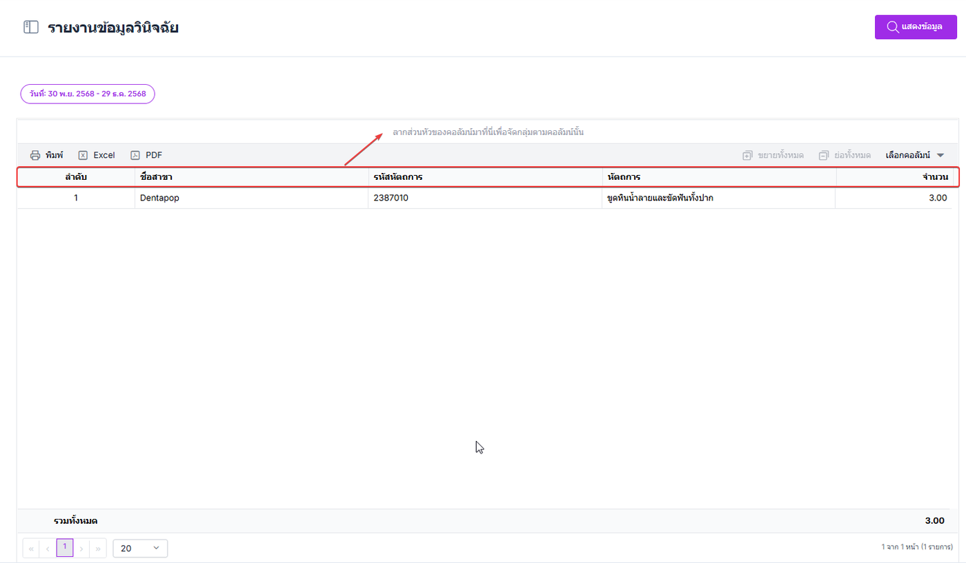 ผู้ใช้งานสามารถลากส่วนหัวของคอลัมน์เพื่อจัดตามกลุ่มของคอลัมน์ได้