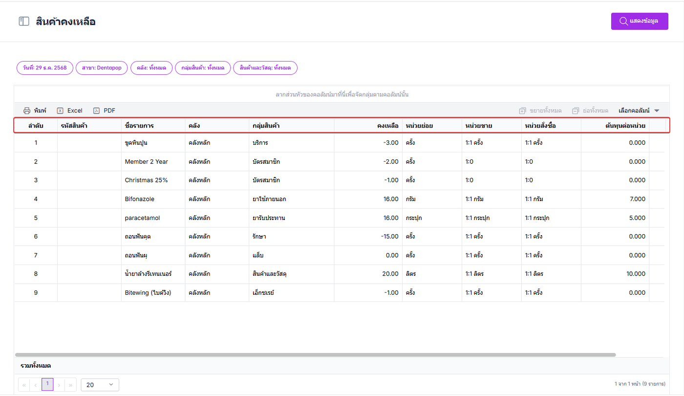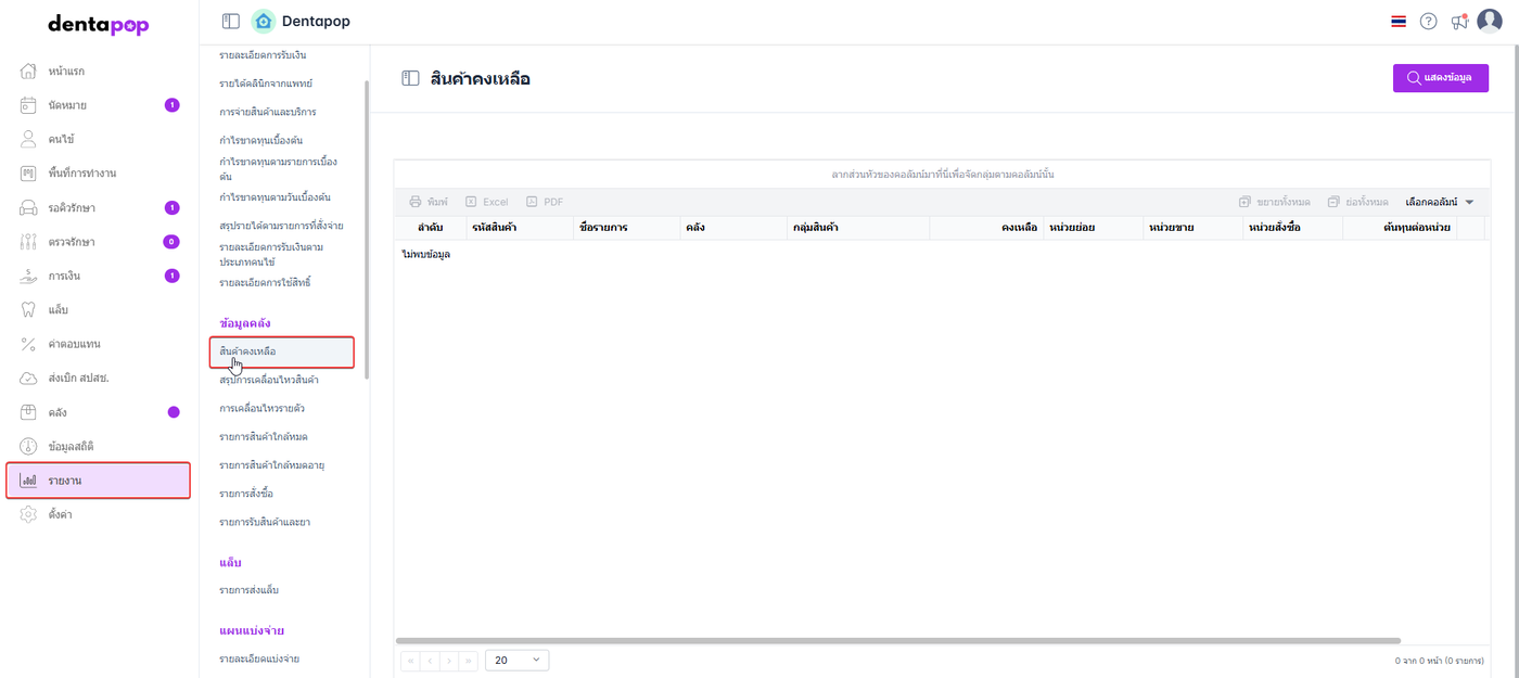รายงานข้อมูลคลังที่เกี่ยวกับสินค้าคงเหลือจะมีการให้ค้นหาข้อมูลเกี่ยวกับยอดคงเหลือของสินค้าต่าง ๆ ที่ถูกเก็บรักษาในคลังสินค้าของคลินิก รายงานนี้สามารถให้ข้อมูลที่มีประโยชน์ในการวิเคราะห์และบริหารจัดการสินค้า