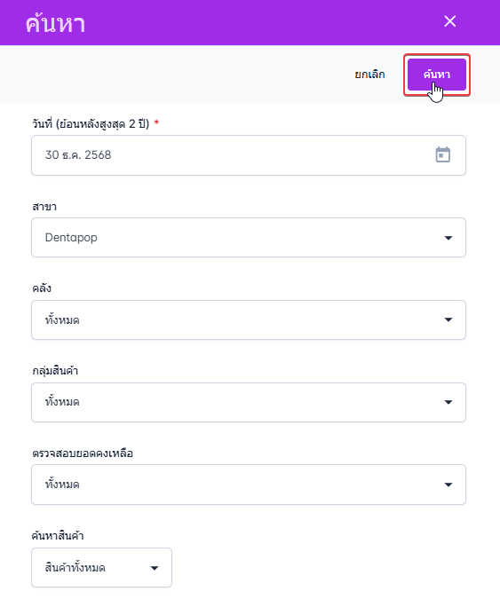 วันที่ (ย้อนหลังสูงสุด 2 ปี) ผู้ใช้งานสามารถเลือกวันที่ที่ต้องการค้นหาได้