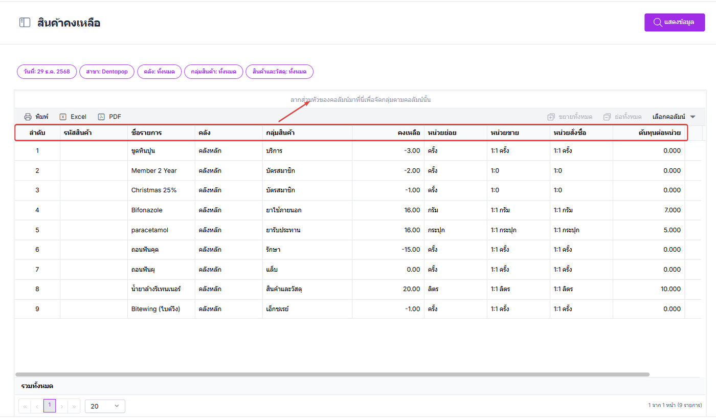 ผู้ใช้งานสามารถลากส่วนหัวของคอลัมน์เพื่อจัดตามกลุ่มของคอลัมน์ได้