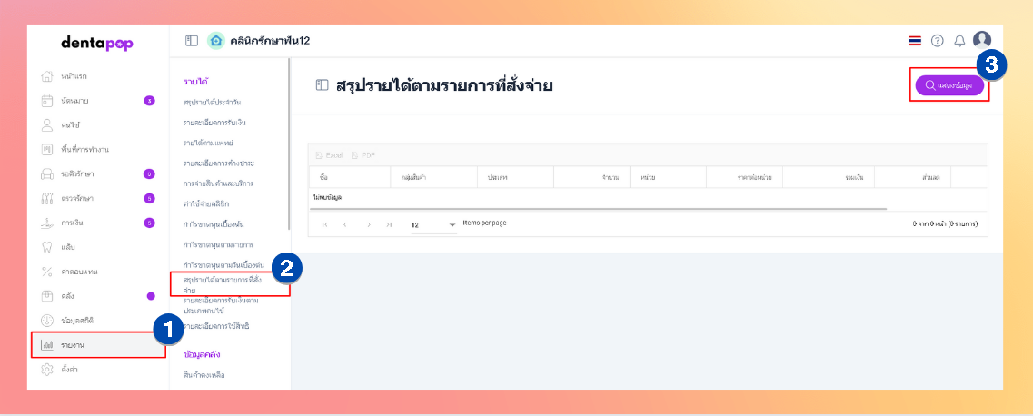 ไปที่รายงาน > เมนูรายได้ > สรุปรายได้ตามรายการที่สั่งจ่าย