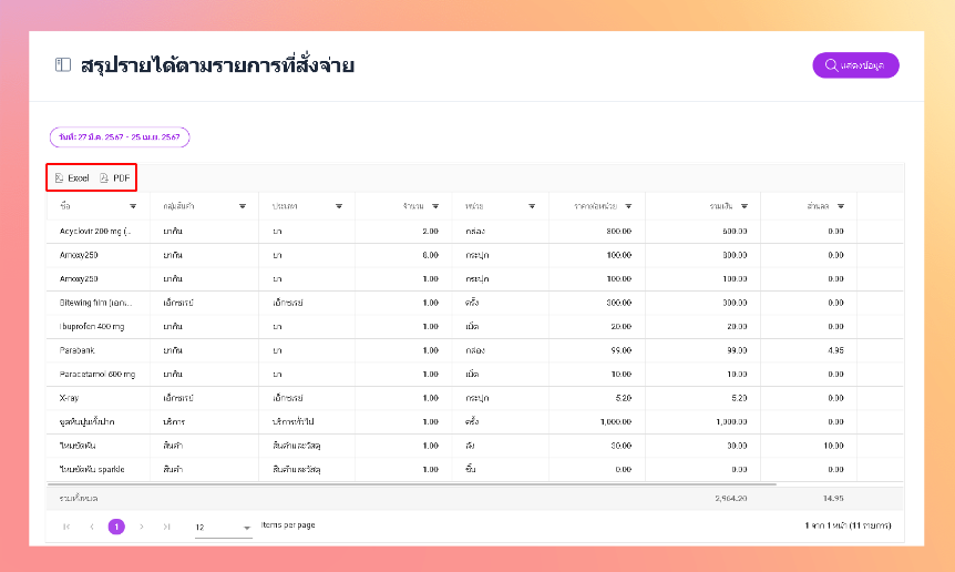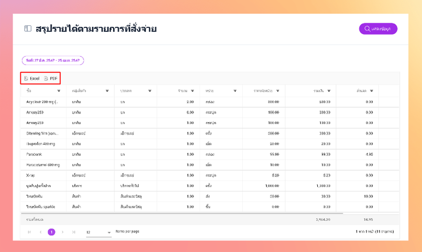 - ระบบจะแสดงข้อมูลสรุปรายได้ตามรายการที่สั่งจ่าย สามารถพิมพ์เอกสารออกมาได้เป็นไฟล์ Excel และ PDF