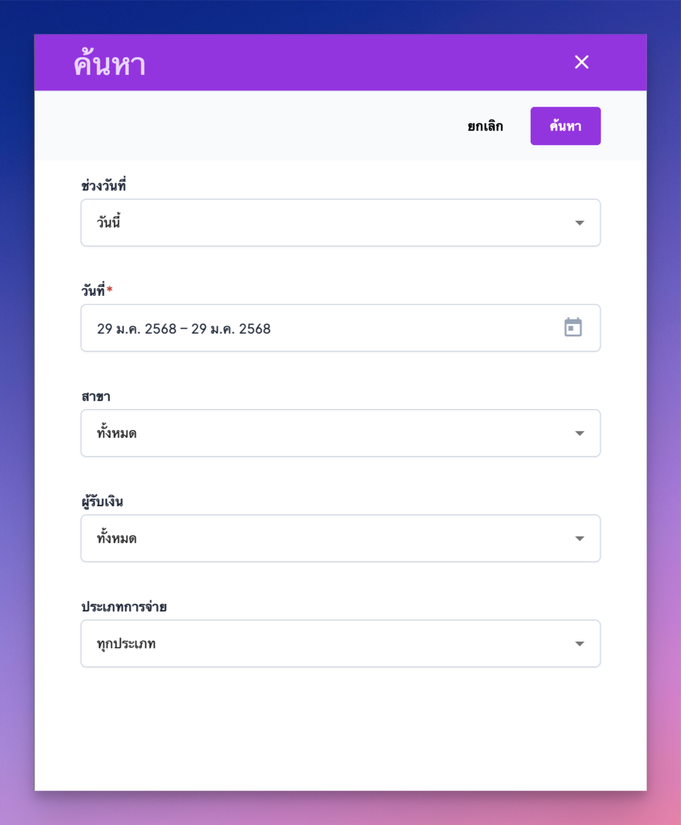 คลิกที่แสดงข้อมูล จากนั้นจะมีหน้าต่างค้นหาขึ้นมาผู้ใช้สามารถระบุวันที่ สาขา เพื่อดูรายละเอียด นอกจากนี้ยังสามารถเลือก ประเภทการจ่ายชำระที่ลูกค้าจ่ายชำระในแต่ละประเภทได้