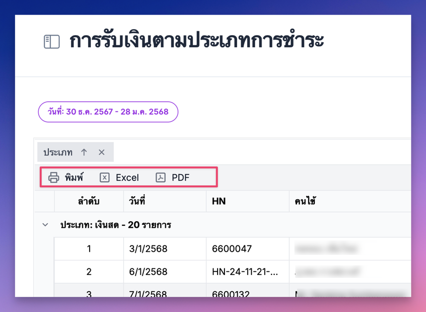 ผู้ใช้งานสามารถ พิมพ์ และ Download รายงานเป็นไฟล์ Exel หรือ PDF ได้