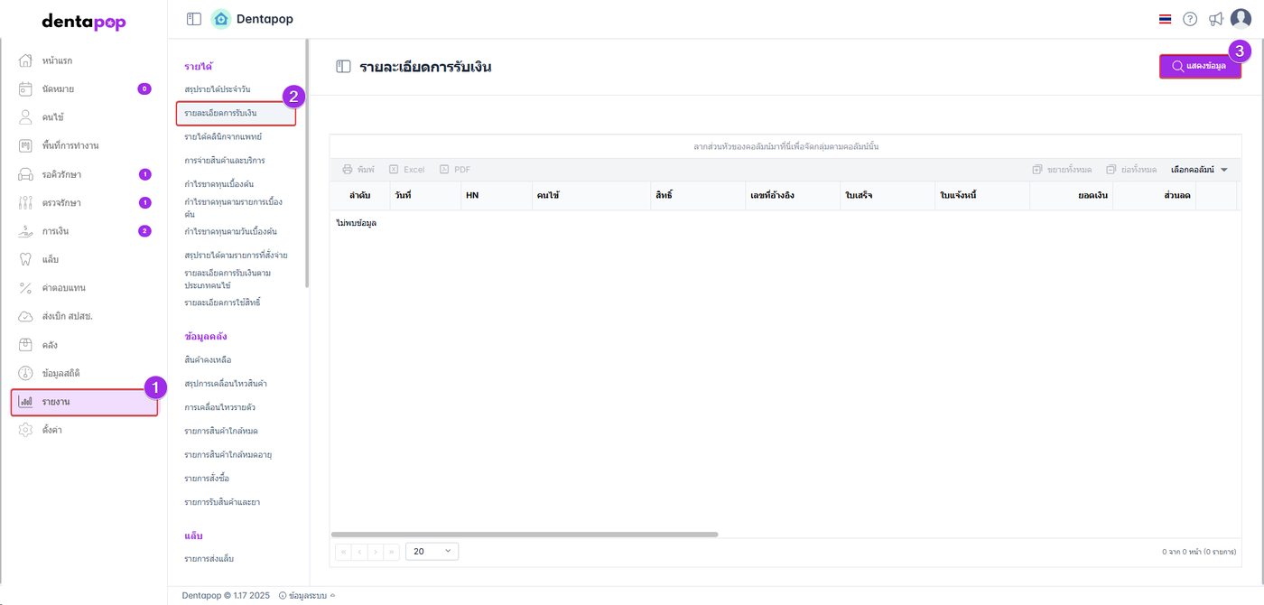 ผู้ใช้งานเลือกหัวข้อ รายละเอียดการรับเงิน