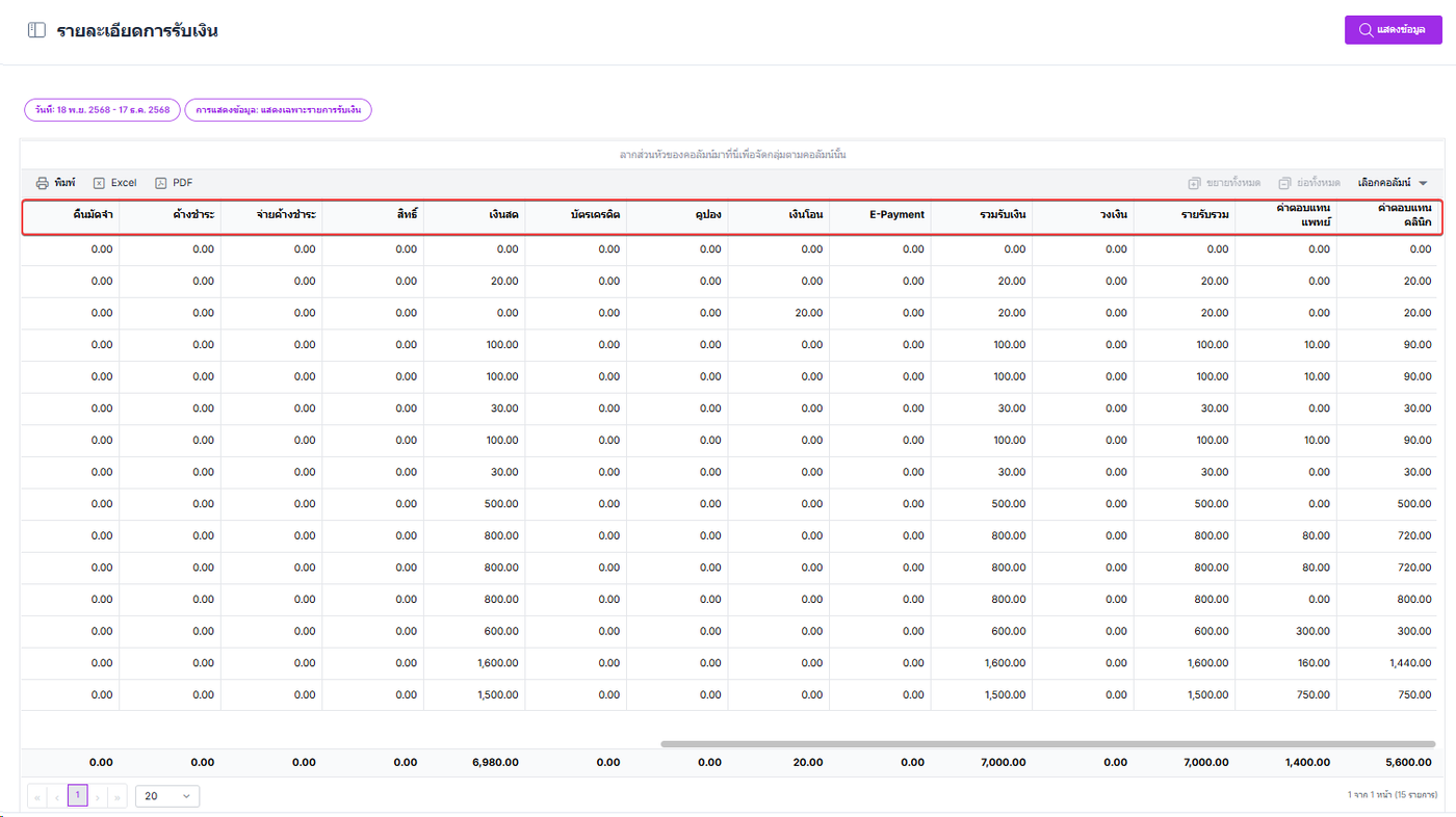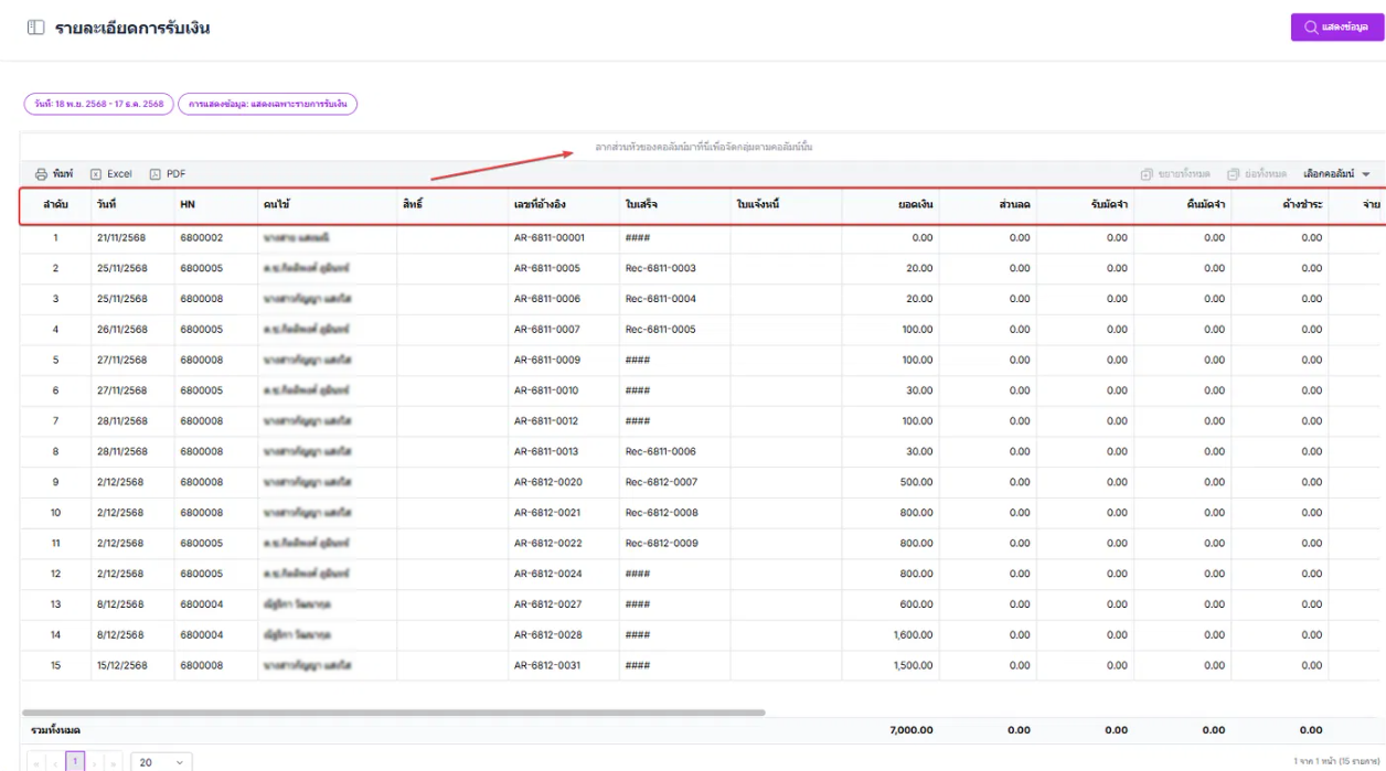 ผู้ใช้งานสามารถลากส่วนหัวของคอลัมน์เพื่อจัดตามกลุ่มของคอลัมน์ได้