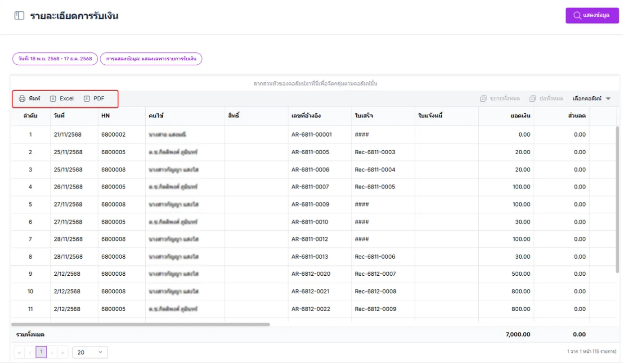 รายละเอียดการรับเงินช่วยให้ผู้ใช้สามารถทำการค้นหาข้อมูลที่เกี่ยวข้องกับการรับเงินของลูกค้าได้ โดยมีความสามารถในการกรองข้อมูลตามหลายเงื่อนไข ซึ่งทำให้การค้นหาข้อมูลเป็นไปอย่างมีประสิทธิภาพและรวดเร็ว
