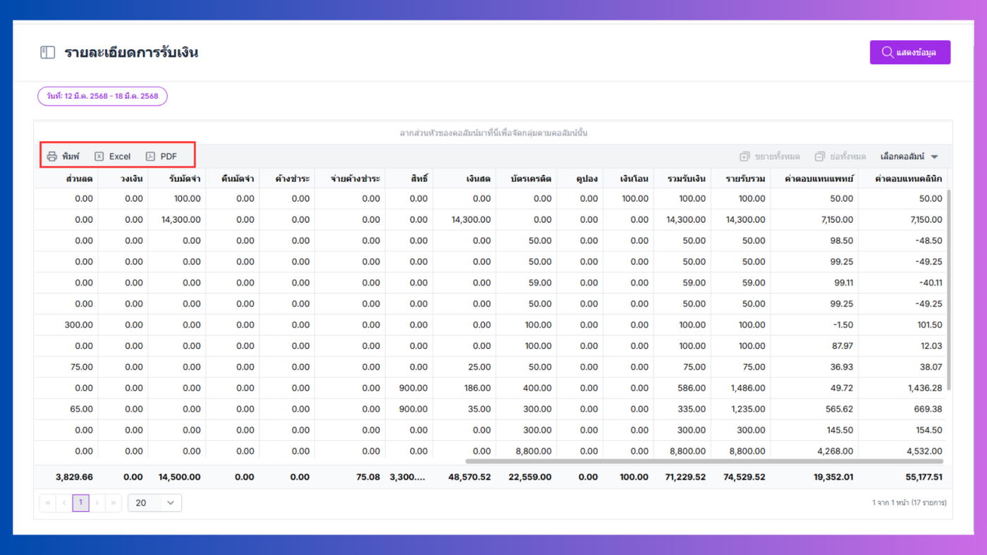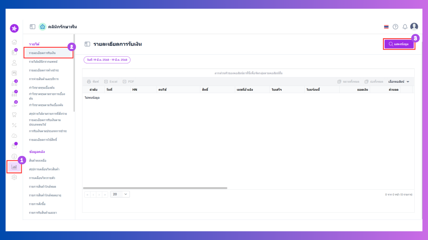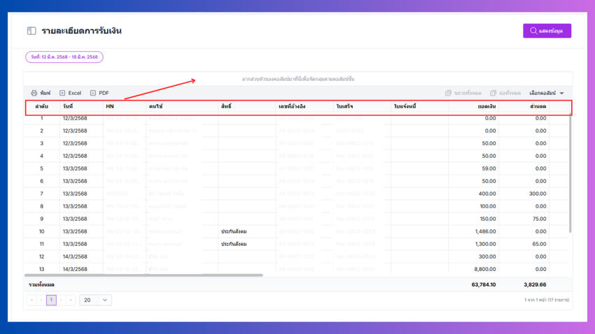 รายละเอียดการรับเงินนั้นช่วยให้ผู้ใช้สามารถทำการค้นหาข้อมูลที่เกี่ยวข้องกับรับเงินของลูกค้าได้ โดยมีความสามารถในการกรองข้อมูลตามหลายเงื่อนไข ซึ่งทำให้การค้นหาข้อมูลเป็นไปอย่างมีประสิทธิภาพและรวดเร็ว