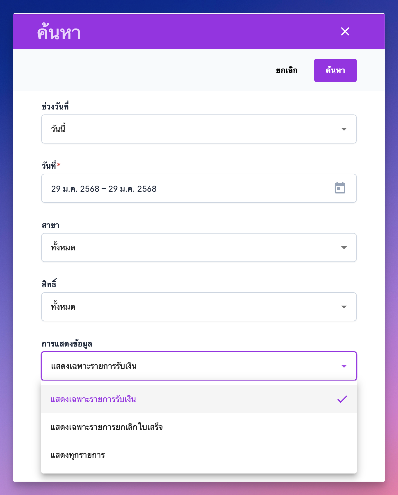 คลิกที่แสดงข้อมูล จากนั้นจะมีหน้าต่างค้นหาขึ้นมาผู้ใช้สามารถระบุวันที่ที่ต้องการทราบรายละเอียดการรับเงิน และ สาขาที่ต้องการดูรายละเอียดได้จากนั้นกดค้นหา สามารถกำหนดเงื่อนไขในการแสดงข้อมูลได้ดังนี้